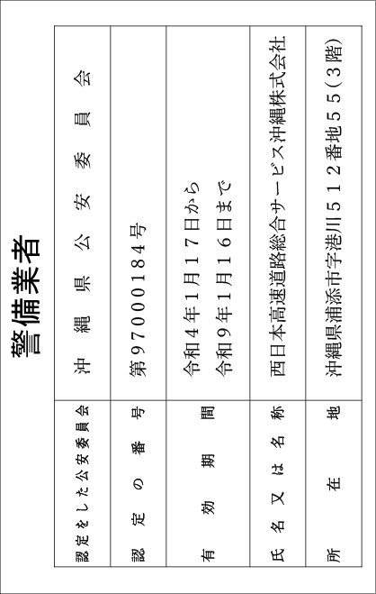 令和6年4⽉1⽇付け警備業法施⾏規則第6条(認定証の掲⽰義務)改正に伴い、下記のとおり掲⽰します。